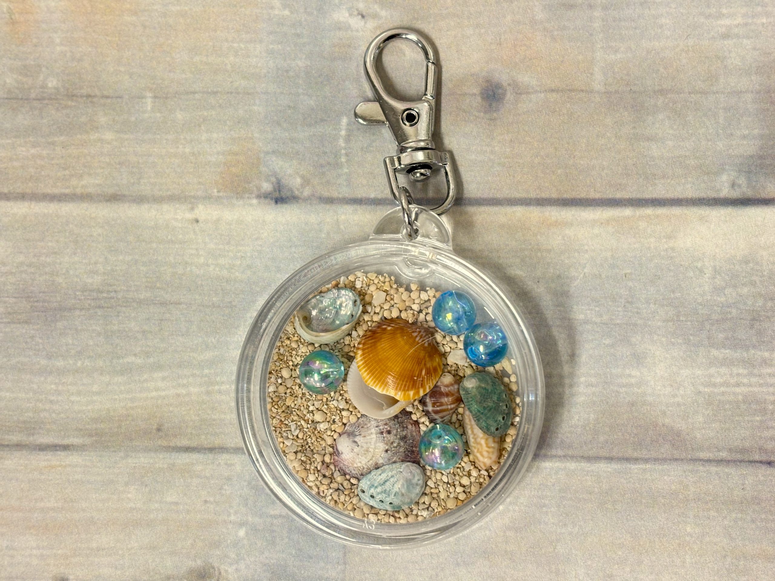 サンゴ砂や貝がらを入れたシャカシャカキーホルダーを作ります