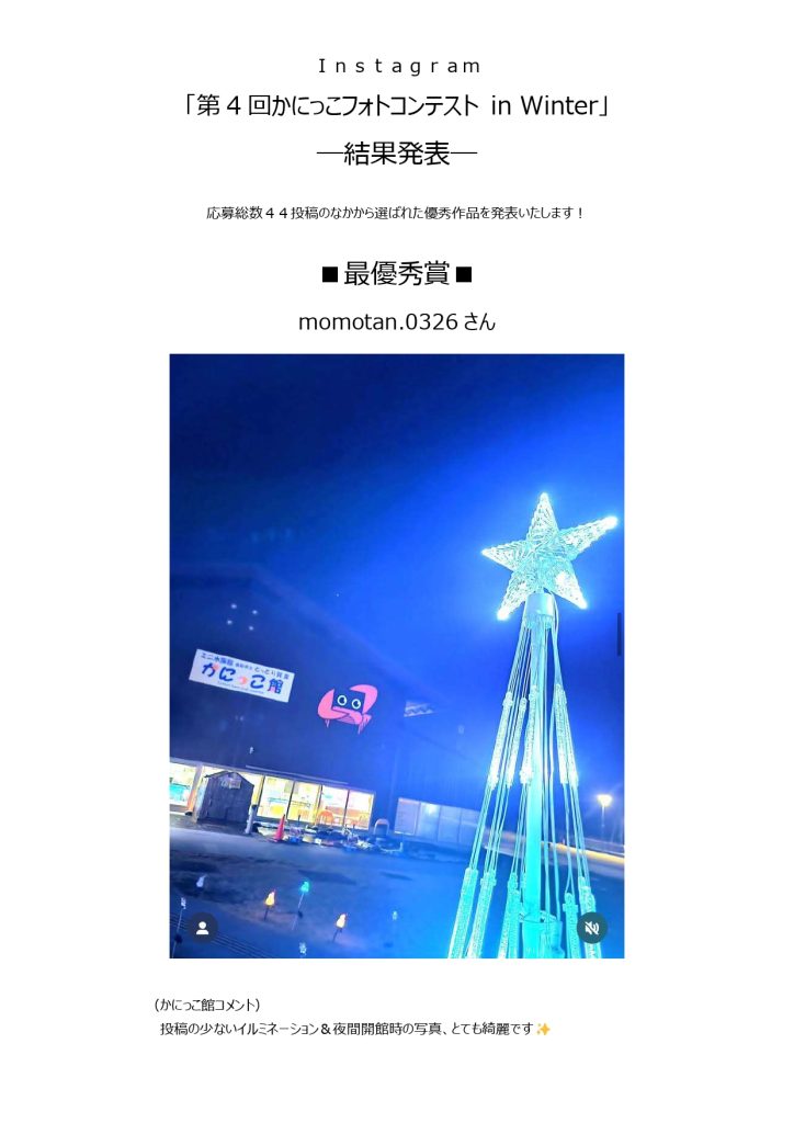 12月20日から1月12日に開催した「第4回かにっこフォトコンテスト in winter」へたくさんのご応募をいただき、ありがとうございました。