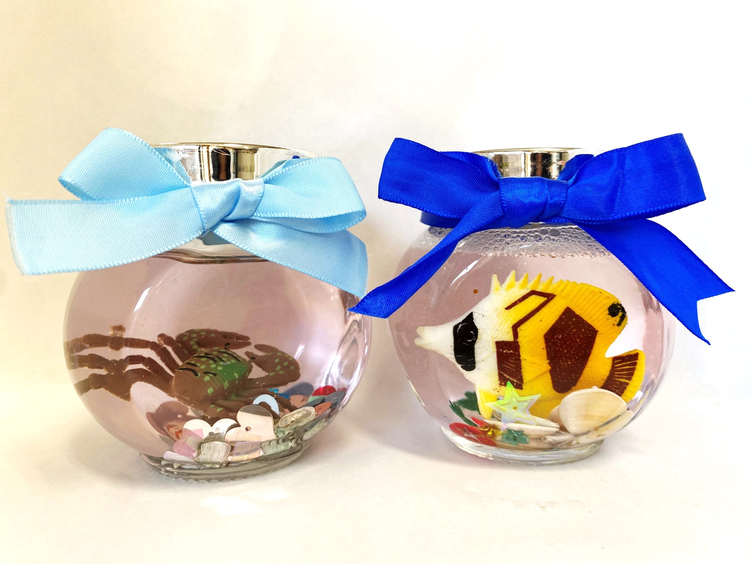 海の生き物フィギュアが入ったビンに貝がらなどを入れて作ります。